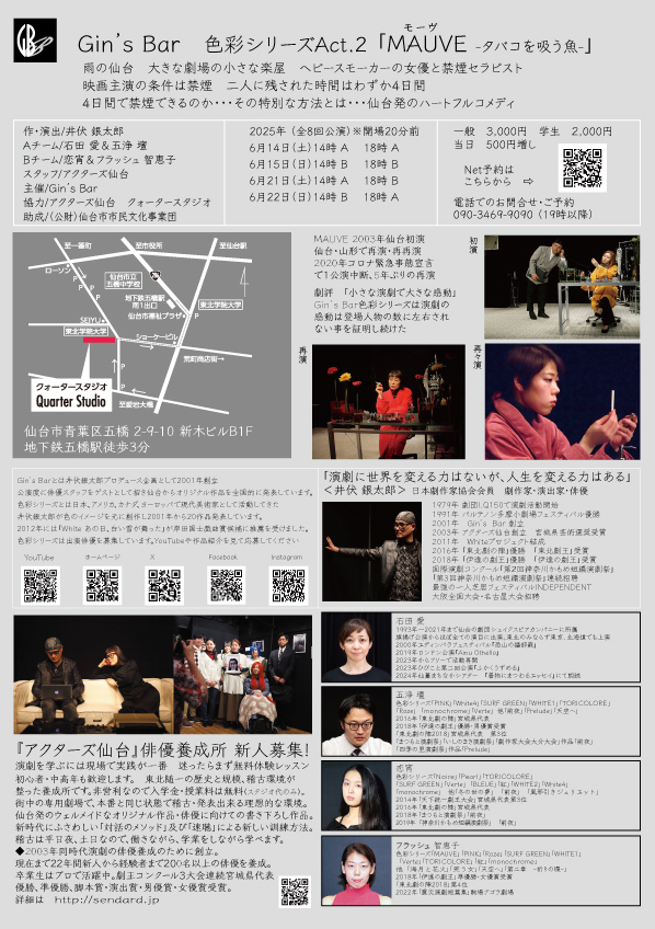 作・演出/井伏 銀太郎 一般 3,000円 学生 2,000円 ■ 会場 クォータースタジオ ■ チケット 一 般3,000円 学 生 2,00円 (当日500円増し) ■ 電話予約・お問合せ 090-7522-1414 (19時以降) ■ 主催/Gin's Bar 090-3469-9090 (19時以降) |